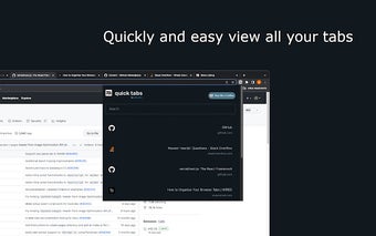 The main feature of Quick Tabs is its ability to perform quick and easy text searches for Chrome tabs. Instead of manually scrolling through numerous tabs or using the traditional tab search function, users can simply type in keywords or phrases to instantly find the desired tab. This can be particularly helpful for users who have multiple tabs open and need to quickly locate a specific webpage.